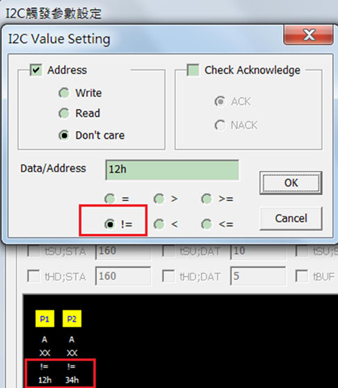 為解決此一問題,可採用邏輯分析儀中的I2C觸發功能來進行定位。首先,先把裝置A(Addr:12h)與裝置B(Addr:34h)的有效位址輸入,然後讓邏輯分析儀找出不符合上述兩個條件的地址,實際設定如圖1所示。