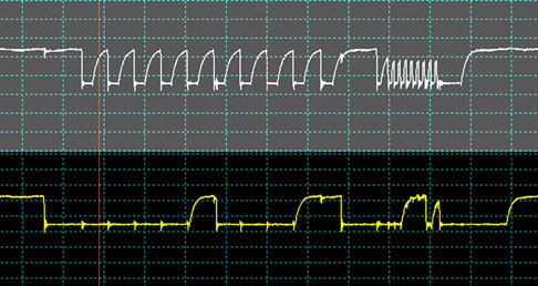 為解決此一問題,唯有透過邏輯分析儀的觸發功能進行訊號定位,這樣抓到的類比訊號才是有意義的。圖8就是利用堆疊示波器並設定觸發之後,同時抓到數位與類比訊號。使用者可將它發送給須要看波形的人,I2C匯流排數位解碼的部分可讓使用者快速理解他所看到波形。而類比訊號的部分,則忠實的呈現出波形的原貌,兩者相結合,即成為最佳的量測方案。