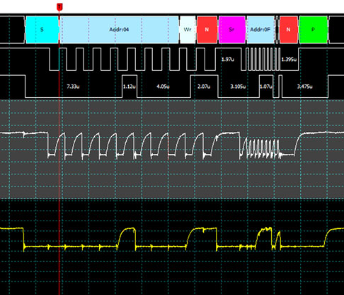 在使用了邏輯分析儀所提供的I2C匯流排觸發與分析功能後。擷取下來的波形開始要進行問題分析階段。由於常常很多專案都是軟、硬體共同合作,參與的人很多,若無法同時看到對應的類比訊號,對於釐清問題幫助不大,尤其是線路造成的問題,使得數位訊號並無法清楚呈現出問題點。然而,使用單純邏輯分析儀堆疊示波器也沒有任何幫助,因為一般而言,邏輯分析儀可以抓的時間長度會遠大於示波器,因此,即使示波器能顯示波形,卻也不在正確的位置上。