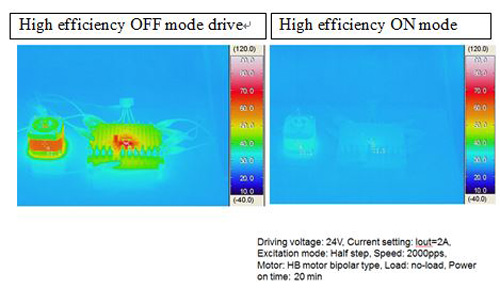 圖5則顯示馬達和LV8702在每種模式下的熱圖像。高能效模式驅動是電流控制模式,降低驅動器和馬達的表面溫度分別達46℃和28℃。這也突顯了顯著提升系統可靠性的可能。