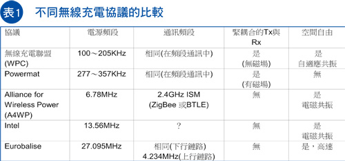 關於不同系統的效率、成本與相容放射標準的比較,表2提供一些參考。這些技術已按照所使用的頻段進行分組,一組是低於500kHz的WPC和Powermat系統,另一組是使用6.78MHz、13.56MHz和27.095MHz ISM頻段的其他系統。