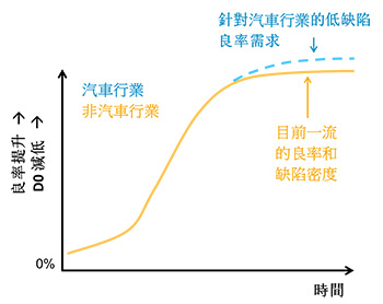 圖2中的A曲線顯示了典型的良率曲線。 如果我們只考慮晶片良率,那麼在某個時候,在這個製程中進一步的投資可能不具備成本效益,因此隨著時間的推移良率趨於平穩。圖2中的B虛線顯示了製造相同產品的同一工廠的曲線。但是,如果他們想要為汽車行業供貨,那麼他們也必須考慮到可靠性不足的成本。在這種情況下,需要進一步的投資來進一步降低缺陷密度,這既能提高良率,又能提升汽車供應商所需的可靠性。