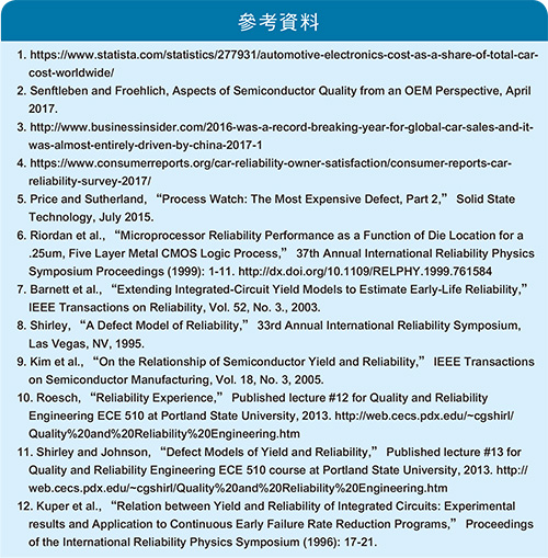 如果一輛普通汽車中有5,000個晶片,汽車製造商每天生產2.5萬輛汽車,那麼即使是百萬分之一(ppm)的晶片故障率也會導致每天超過125輛汽車因為晶片質量出現可靠性問題。