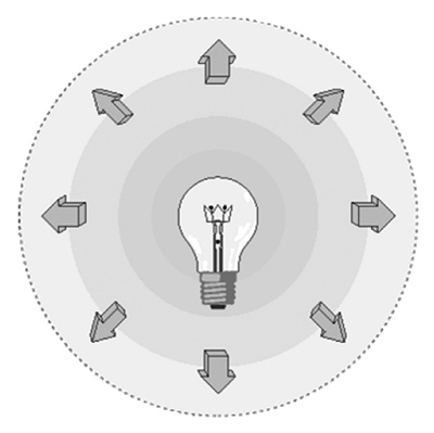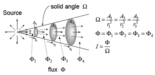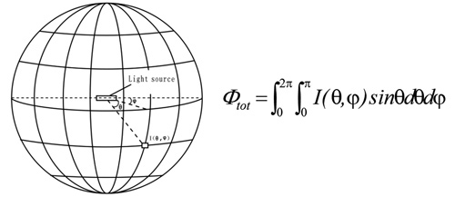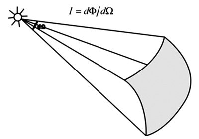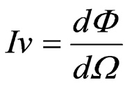光強度(Luminous Intensity, Iv)是指光源在某一方向單位立體角中所發出的光通量大小,也就是說單位立體角內有多少流明發出(圖9)。單位是燭光(cd),可表示成:![]() 其量測的方法是,一般以量測照度值再乘以距離平方即得光強度。實際測試需要照度偵測器,以及測距工具,如尺或雷射測距儀,使用此法測試距離必須夠長,將待測光源視為點光源。使用配光曲線儀即為以照度偵測器量測各位置照度值再乘上量測光路距離的平方(圖10)。