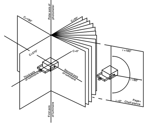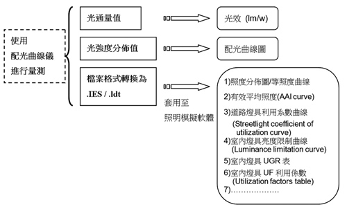 上述為五個基礎測試物理量,光源或燈具的光源特性依此五個量測量,可衍生出包括光效、配光曲線圖、照度分布圖、眩光指數(SLI)、色溫(Color Temperature)、演色性(Color Rendering Index, CRI)等六個常見的評估項目。其中,光效評估是將燈源的總光通量除以電源消耗功率即得光效,單位是lm/W。配光曲線圖,亦即極座標光強度分布圖,是使用配光曲線儀,將光源於各空間分布的光強度大小量出以極座標方式呈現,即為配光曲線圖(圖14),一般單位是cd;有時會將光源燈具的總光通量視作1,000lm,呈現相對光強度分布,單位為cd/klm。