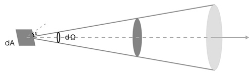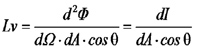 亮度(Luminance, Lv)的基本概念是,一光源或一被照面的輝度為單位表面在某一方向的光強度密度,也就是被視物體在視線方向單位投影面積上的發光強度(圖11)。單位為cd/m2,可表示為以下的公式。![]() 公式中dA為被視物體的單位面積,ε為單位面積法線與觀察方向間的夾角,dΩ是單位面積在某一方向上所張的立體角元,d2Φ是單位面積在觀察方向的立體角元內的光通量,而dI是單位面積觀察方向的發光強度。