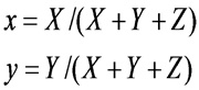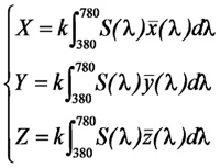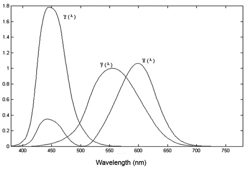 人眼對於顏色的感知是由可見光的輻射功率傳遞而來。1931年,CIE根據混色原理做了配色實驗,當時把人眼對光反應的情形量化,分別為感紅色、綠色和藍色細胞的反應量所得到三條反應曲線,稱為色匹配函數(Color Matching Function),如圖13所示,並從光譜分布導出一套三刺激值,如下所述三個積分方程式定義:![]() 其中X、Y、Z是刺激值;S(λ)是刺激物的光譜功率分布; ![]() 顏色量測可分為兩種方式,一種是使用濾光片式偵測器,另一種為使用光譜儀進行光譜量測。使用濾光片式偵測器時,在光偵測器前加濾色片(一般有三個或四個濾色片),讓色度偵測器的光譜靈敏度曲線與CIE 1931 XYZ三刺激值相匹配,色度量測的精確度與色度偵測器的匹配程度相關。因三刺激值中的與人眼視效函數一致,所以也可量測光源亮度。此種測試儀器一般稱為亮度計或輝度計,對準待測點直接讀取(x,y)。