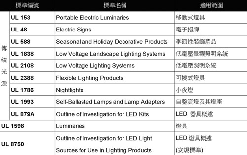 美國檢測公司優力(UL)對於傳統光源的安全評估標準已有相關法規並執行已久,近年來UL一直探索LED照明方面的安全標準,找尋與並傳統光源的差異項,於已存在之傳統光源的安全規範增加LED安全要求或須另行提出規範。目前,UL提出相關LED照明安全規範,如表5所示,表中並將傳統光源的安全規範一併列入供參考。