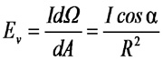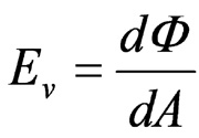 照度(Illuminance, Ev)是光通量與被照面面積的比值,1lx的照度為1lm之光通量均勻分布在面積為1平方公尺的區域,單位為勒克斯(Lux, lx),可表示為:![]() 對點光源來說,dΦ=IdΩ,因而照度為: