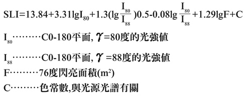 眩光指數(SLI)則用於評估道路照明中的眩光。此眩光除涉及燈具外、還與燈具的布置安裝高度等有關,SLI值為考慮單個燈具的不舒適眩光。計算公式如下: