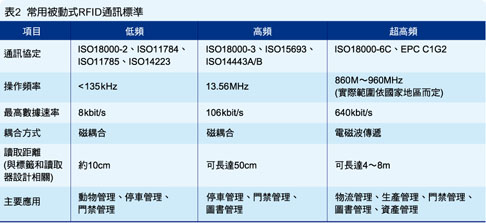 常用的被動式RFID通訊標準(表2),依頻率可分為低頻、高頻和超高頻等款式,各主要功能特性隨著通訊協定和操作頻率設計差異,各有不同的應用。當然,RFID仍有其物理特性限制,許多人性面的問題仍須要搭配各種監控系統包括攝錄影機、各種溫度、濕度、壓力、可見光與不可見光、特殊氣體及放射性的感應器和其他的有線和無線電通訊系統,以建構完整的解決方案。