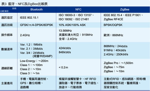 藍牙(表3)通訊屬於無線個人區域網路(WPAN),初期希望藉以取代RS-232電纜線,可連接數個藍牙裝置。藍牙裝置在第一次連線時須花較長的時間建立連結關係,而且可同時連結的裝置個數最多七個。藍牙標準2.1版,主要應用在手機和耳機的無線語音連線、電腦周邊(如印表機、滑鼠)控制、遊戲機、GPS地圖導覽、數位相機等。