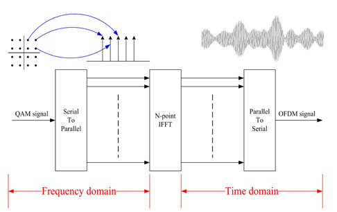 然而如OFDM可有效利用頻寬的調變技術卻大幅提高訊號的峰值因數(PAPR),舉例來說,現行3G無線通訊寬頻分碼多重存取(WCDMA)的PAPR約為58dB,而下一代通訊標準全球微波存取互通介面(WiMAX)的PAPR卻高達12dB,高PAPR的訊號將導致發射器的線性度要求大幅提升,及功率放大器的效率急速下降。由於OFDM調變訊號是由多個正交的副載波(Subcarrier)訊號疊加而成,可大幅增加頻譜利用率,但也因多個副載波訊號的疊加,造成高PAPR。目前OFDM訊號的產生是將每一筆正交幅度調變(QAM)訊號對應到每一個副載波,然後再經由逆向快速傅立葉轉換(IFFT)運算而成(圖1)。所以當發射器有任何非線性失真產生時,接收器經由正向快速傅立葉轉換(FFT)反運算後,所得到的QAM訊號上的每一筆資料都會產生誤差,這個現象是OFDM訊號特有的。所以用OFDM作為調變訊號的通訊標準皆訂有高規格的線性度要求,以WiMAX系統為例,其線性度指標錯誤向量的大小(EVM)必須低於-30dB。