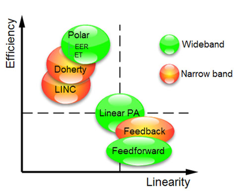 目前的發射器類型大約可區分為兩大類,一種是提升線性度,如回授(Feedback)、前饋(Feedfoward)及預失真(Predistortion);另一種是提升效率,如LINC、Doherty、封包消弭與回復(EER)、追蹤訊號封值(ET)等。如果以線性度及效率來作圖的話,則這些發射器即如圖2所示。