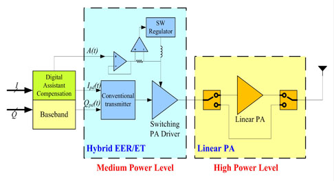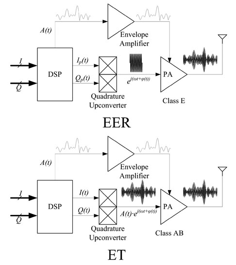 而在ET架構中,主要訊號處理方式都與線性發射器相同,功率放大器亦是採用線性的功率放大器,差別是ET的架構多了一個封包路徑,動態調整線性放大器的電源供應端,用以減少線性放大器的固定偏壓所造成的功率損失。近來論文中,將ET架構中的線性放大器改為切換式放大器,並稱其為混合式(Hybrid)ET架構,因此EER與Hybrid ET的差別只有功率放大器的輸入訊號不同。EER的放大器輸入訊號為RF的相位訊號,訊號中沒有振幅的改變,而Hybrid ET的輸入訊號為完整的調變訊號。理論上,EER可以發揮切換式放大器的最高效率,所以會有較高的整體效率表現,但是其非線性失真,尤其是對OFDM的調變訊號,比Hybrid ET來得嚴重,所以其線性度表現比Hybrid ET差。