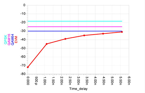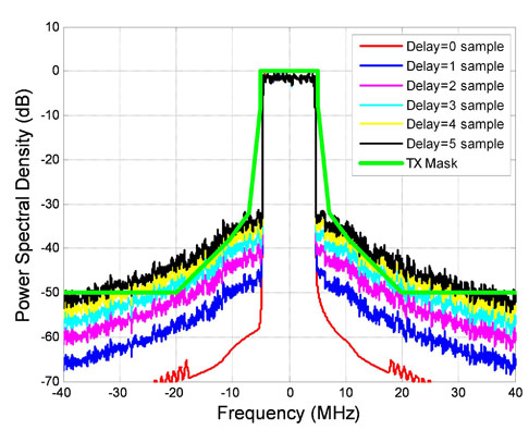 圖4為WiMAX應用於極座標發射器的路徑不同步失真,圖中所顯示的不同步是以取樣率為單位,一個取樣的不同步約為1.116奈秒。由模擬結果顯示,要符合WiMAX的發射遮罩(Transmission Mask),極座標發射器的不同步必須要小於2奈秒。而路徑不同步對於WiMAX的線性度指標EVM影響較小。EVM隨著不同步增加而變差,圖5顯示的是路徑不同步對EVM的影響,當路徑不同步為5.5奈秒時,EVM約達到-30dB。
