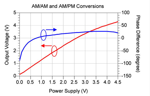 第三個非線性失真是由於改變切換式放大器的電源所造成的輸入振幅對輸出振幅(AM/AM)及輸入振幅對相位差(AM/PM)的非線性失真,該非線性與切換式放大器的設計有關,圖7是一個典型的切換式放大器的AM/AM及AM/PM非線性失真。