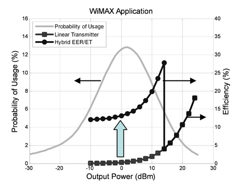 為達到OFDM調變訊號的高線性度要求,目前WiMAX發射器普遍採用線性功率放大器,並搭配大量的功率回退(Power Back-off),以達到高PAPR的線性度要求。線性功率放大器於最高功率輸出時可達到最高的輸出效率,應用於WiMAX系統時,在輸出功率為24dBm時,最高輸出效率約為18%。然而WiMAX系統並不會全時最高功率輸出,它會根據使用者距離基地台的遠近而調整發射器的輸出功率,若對發射器的效率與輸出功率的使用機率做積分的話,則平均效率將低至約為3%。由於發射器的耗電量約占整個手持式裝置的一半,這樣低的發射效率將導致電池的使用時間大為降低。以一個WCDMA的電池為例,如果應用於WiMAX系統,則通訊時間約為原來的四分之一。