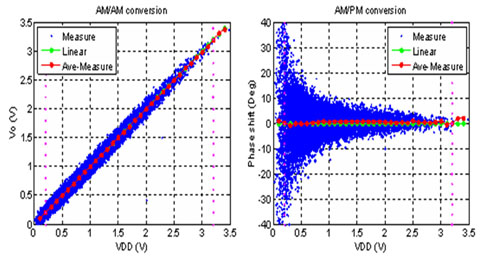 目前設計中的Hybrid EER/ET IC,其WiMAX的輸出功率在17dBm時,整體輸出效率為27%。未加入數位補償演算法的情況下,模擬的AM/AM及AM/PM非線性失真如圖12所示。從圖中可觀察到,整個的Hybrid EER/ET系統相當的線性。AM/AM曲線非常的線性,且最低點可以通過原點,所以沒有饋通效應的非線性失真。另外由AM/PM曲線可看出,還是有一些非線性失真在低電源的時候產生較大的相位差。在這樣的情況下所測得的EVM為-29.92,相當接近WiMAX 10MHz 64QAM的-30dB要求。