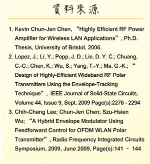 針對平均效率的提升,將極座標發射器應用於中低功率的輸出,此時線性功率放大器將被旁路並且關閉;當需要大功率輸出時,則由極座標發射器與線性功率放大器串接輸出。圖9為輸出功率的使用機率、線性發射器的效率及Hybrid EER/ET系統的效率作圖。