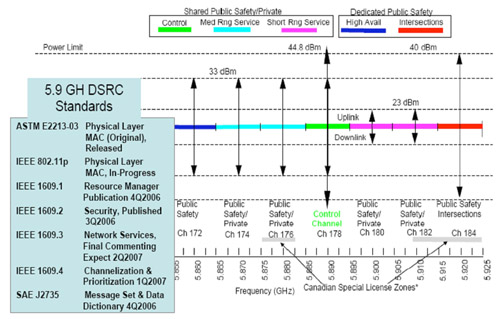 但由於其成本高昂,距離商業化應用尚有一段距離;目前反而是以由美國交通部結合八大車廠與各州交通廳,共同規畫執行之車輛基礎設施整合(Vehicle Infrastructure Integration, VII)計畫所使用之5.9GHz WAVE/ DSRC車輛專用短距離通訊技術尤為全球所矚目(圖1)。若一切如期進展,將於2010年後提案呈交國會,2011~2012年全國布建。預估美國主要路段布建二十三萬九千個路側單元(Road-Side Unit, RSU),且所有銷往美國之車輛皆須加裝DSRC 5.9GHz車載設備。得益於IEEE的努力推動,實體層技術已經成為IEEE技術標準規範之一,稱為IEEE 802.11p。