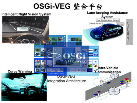 OSGi發展組織為擴大中介軟體(Middleware)平台的應用範圍,特別成立「汽車平台專家群組」(Vehicle Expert Group, VEG);其主要任務為針對汽車應用研究並規畫符合車內駕駛環境下的各項服務,以及如何透過OSGi平台的功能予以精簡及效率化,將車內各種通訊介面、人機介面以及汽車電子元件加以整合(圖8)。2007年3月,VEG於例行專家會議中提出相當完整的技術需求規畫,並整理歸納出八項最重要的技術需求(Top-8 Requirements):