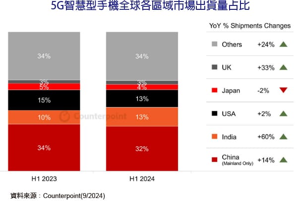 根據Counterpoint的最新研究,2024年上半年全球5G手機出貨量同比增長了20%。印度超越美國,首次成為全球第二大5G手機市場,僅次於中國。