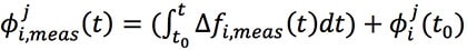 式子(6)中的Φij雖是指載波的相位,但它的最終計量單位不是角度,而是和Pij一樣的距離單位,其實就是將測得的相位換算成週波數,再乘以載波波長就得出距離。Φij和Pij的最大不同在於Ni。這是因為從GPS衛星發射的訊號到達接收器的天線,這一段距離是載波相位模型無法知道的。此外,GPS接收器的天線何時接收到載波訊號也是無法固定的,因為不同GPS接收器的硬體效能,這個接收初始值也會不同。為了幫助理解,可以使用積分將式子(6)改寫成式子(7)。其中,ρj被三個項式Δfi,meas(t)、Φij(t0)、