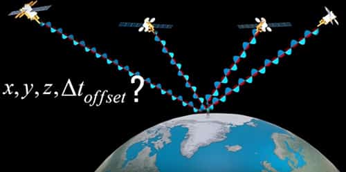 因為從GPS衛星發出射頻訊號,並以光速到達地球表面會有時差,即使那只是一到幾奈秒的時差,但將它乘以光速3 108m/s後,結果卻有至少0.3公尺以上的誤差。每個GPS衛星內部都有原子鐘,而且時間都是一樣的。但一般手持的GPS接收裝置內部沒有原子鐘,於是因傳收時脈(Time Clock)的不同步,就造成訊號誤差。此外,依照狹義相對論(Special Relativity),GPS衛星內部的原子鐘的時間和地球上的時間也不一樣。所以,至少需要四個GPS衛星才能求出這四個未知數:X、Y、Z座標值和時間變數t,式子(1)是其數學表示式。