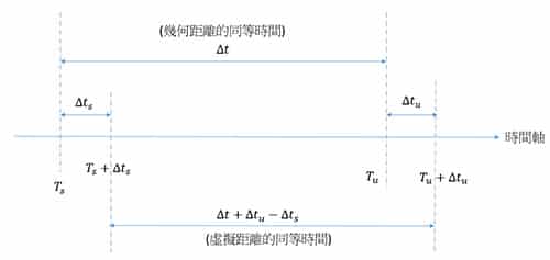 由式子(2)計算出來的實際距離Ri,稱作幾何距離。幾何距離、虛擬距離、時間誤差之間的關係如圖2所示。幾何距離的同等時間Δt=Tu-TS,其時間誤差為0。虛擬距離的同等時間為