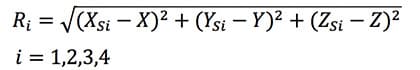 按照三邊量測法,第i號GPS衛星的三維座標(XSi,YSi,ZSi)和GPS接收器的三維座標(X,Y,Z)之間的實際距離Ri等於式子(2)。(XSi,YSi,ZSi)和ΔtSi可以從第i號GPS衛星發射的調變訊號中,解調後得出。ΔtAi可以透過雙頻測量(Dual-Frequency Measurement)得出。PRi則是由GPS接收器將接收到的第i號GPS衛星的時間訊號和其內部時鐘做比較,換算為發射時間和接收時間,再乘以光速後得出。