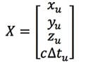在式子(1)中,有四個未知數:(X,Y,Z)和Δtu,可以用一個向量X來表示,如式子(3)。X也稱為狀態向量(State Vector),xu、yu、zu是GPS接收器的三維座標。因為i=4,所以X就是這組非線性方程式的唯一解。求解X的方法是先建立一個數學模型,將每一個非線性方程式化成泰勒級數展開式(Taylor Series Expansion),然後使用最小平方法(Least Squares Method)計算出最小誤差值,再將這個誤差值輸入此模型中,如此反覆運算,最後得出符合條件的最小誤差,同時得出X的唯一解。若i<4,X無解。若i>4,可以使用最小平方法得出X的最佳解。