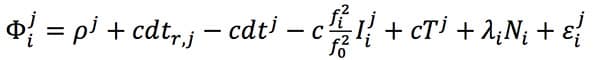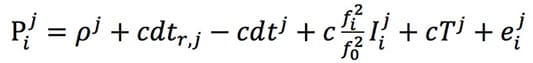 式子(5)是常見的多頻GPS虛擬距離量測方程式,比式子(1)要複雜。式子(6)是常見的多頻GPS載波相位(Carrier Phase)量測方程式,它和上述的虛擬距離量測模型類似,也是一個量測距離用的數學模型。其中,i是頻率,j是衛星編號,r是接收器編號。Pij是虛擬距離,Φij是載波相位。ρj是GPS衛星和接收器之間的實際距離。c是光速。dtr,j是接收器的時間誤差,dtj是衛星的時間誤差。fi是載波頻率,f0是GPS的基本頻率10.23MHz。Iij是受到電離層影響而產生的時間延遲。Tj是受到對流層(Tropospheric)影響而產生的時間延遲。λi是載波相位的波長。Ni是非整數(分數)的模糊參數。eij是測量虛擬距離時的其他未模型化誤差,εij是測量載波相位時的其他未模型化誤差。