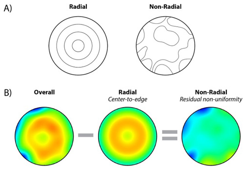 | 圖2 製程的不均勻度可分為徑向以及非徑向(A)。在一張顯示整體不均勻度的晶圓圖上,若移除徑向對稱性,可找到更困難的非徑向不均勻度(B)。 |