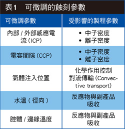 過去幾年來,蝕刻腔體的設計有了許多的改變,以改善徑向對稱性(圖2A)。舉例來說,電容式耦合電漿(CCP)蝕刻腔體的主要硬體參數,是陰極與陽極之間的間隙。傳統以來,此間隙的設計是用來為特定的功率、壓力、以及氣體化學混合物提供最均勻的蝕刻結果。在電感式耦合電漿(ICP)蝕刻腔體中,氣體注入的位置是一項重要的設計特性,而且會依製程而有所不同。在鋁蝕刻腔體中,反應物氣體是從晶圓上方的蓮蓬頭送出的。針對矽晶蝕刻,反應物氣體是從晶圓周圍注入的,但後來演進為氣體是從晶圓的中央上方注入。