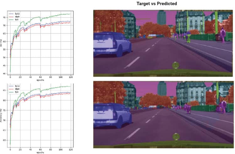 新的處理器架構有助於強化AI的效能及功能,此系統可以在不影響模型收斂和準確度的前提下,運算大規模的模型,達到良好的算力及能源使用效益。支援FP8的處理器可以最大化複雜模型的訓練及推論效能,並在關鍵指標如Top 1 Accuracy或IoU上可以保持與原來相差不遠的效能表現。且處理器對區塊結構稀疏化的原生支援,包括用於壓縮的矩陣乘法指令等,有助於深度學習模型進一步提高效能。