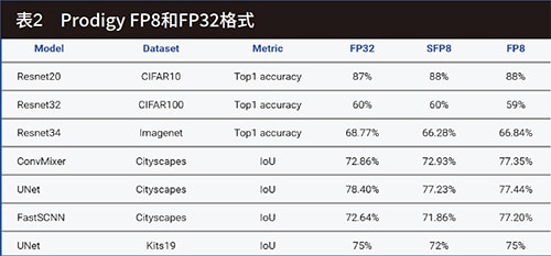 量化是其中一種優化模型的技術,可有效減少神經網路模型占用的記憶體,以及神經網路訓練和推論的時間。量化的原理是減少神經網路中,數值的精度,包含權重(Weight)和網路內的運算。以Prodigy為例,其8位元浮點規格(FP8)具有1、5、2位元的符號(Sign)、指數(Exponent)、尾數(Mantissa)格式,並在這之中謹慎選擇格式來表示權重、特徵向量(Activation,或稱為Feature map)、誤差量和梯度(圖1)。16位元浮動規格(FP16)具有1、6、9格式,用於通用矩陣(GEMM)堆積。在對神經網路中的資料分布進行研究,特別是在ResNet18、ResNet101和SqueezeNet應用於Cifar100和ImageNet資料集,所得到的梯度統計結果,FP8和FP16格式都被選用。上述研究的目的,重點在於取得準確度和動態範圍的平衡。