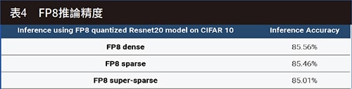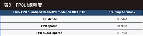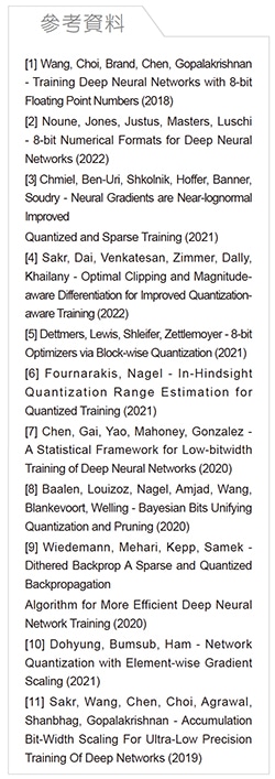 即便市場上的運算平台硬體支援以FP16為主流,FP8運算平台仍可以有效訓練DNN模型。為了充分利用8位元運算平台的優勢,不只是8位元的整數型態,廠商如Tachyum也採用8位元的浮點數型態,用於訓練DNN模型的前向及反向傳遞(Forward and Backward Pass)運算。然而降低精度的同時,仍保留模型準確度,需要克服幾項挑戰。首先,當所有用於GEMM和卷積運算的運算元,也就是權重、特徵向量、誤差和梯度減少到8位元時,大多數的DNN模型準確度會明顯下降。其次,將GEMM中堆積的位元精度從32位元降低到16位元,將明顯影響DNN模型訓練的收斂。