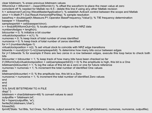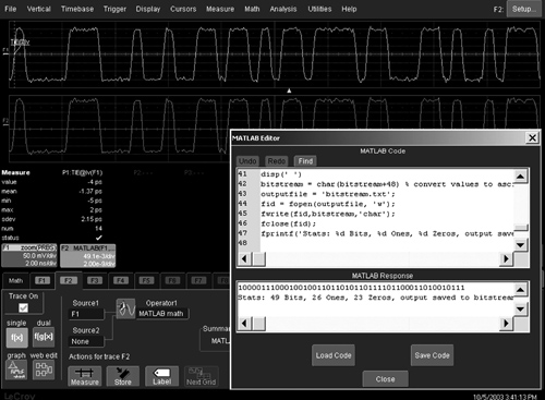 | 圖9 示波器進階波形計算功能顯示出波形編碼後結果–F2是客製化波形運算功能,採用Matlab Script自動解譯每一個位元,此演算式讀取TIE參數所設定之資料傳輸速率去判別每一位元的界線,演算法經過每一波形的邊緣,即登錄此串列波形之邏輯位元,逐一執行後,解譯後之數位編碼與統計結果將被顯示於檔案上。 |