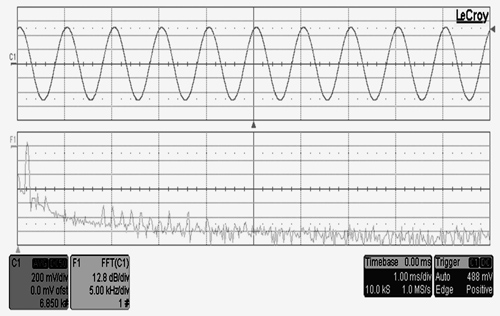 | 圖2 示波器於波道1輸入一個1kHz正弦波,因此在頻譜圖可觀察到1kHz的頻率。 |