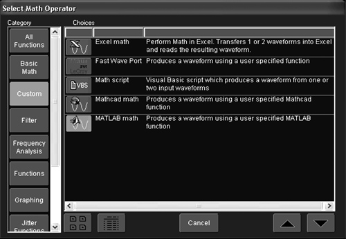 | 圖4 示波器圖形化操作選單,左側是目錄分類,進階數學運算是客製化,然後再選擇應用程式,如Math Script。 |