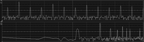 | 圖7 上方波形為示波器運算輸入訊號之FFT結果,水平軸單位是頻率,十進制單位,下方波形是經過進階運算功能運算所獲得之波形,水平軸以10為底之對數單位,兩者可同時在畫面上顯示。 |