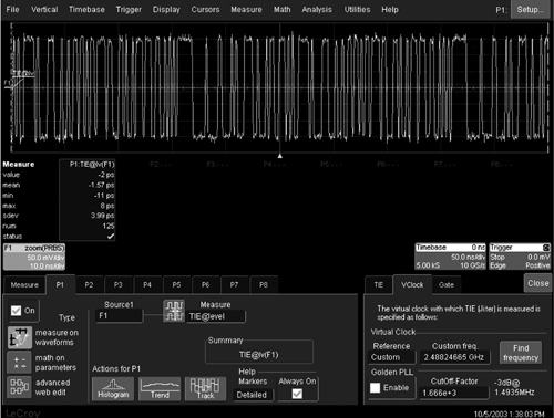 | 圖8 示波器波形F1是一筆NRZ串列數據,P1參數是TIE@lv(Time Interval Error),選單內之虛擬時脈(Virtual Clock)計算出此訊號之資料傳輸速率是2.488Gbit/s之OC-48資料串。 |