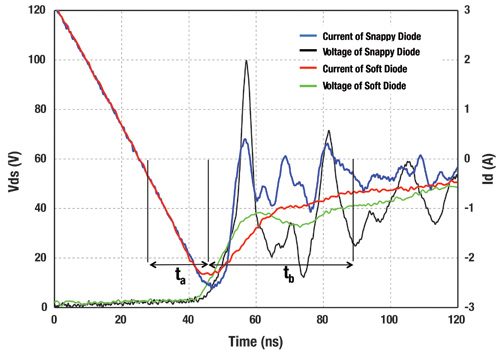 | 圖5 反向恢復特性下的電壓尖峰比較 |
