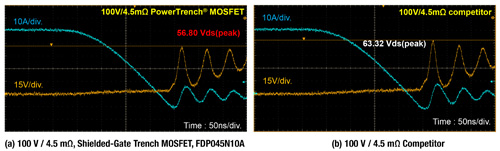 在輕載條件下,這可能比有小1mΩ的RDS(on)更重要。(a)顯示透過比較快捷半導體(Fairchild)的FDP045N10A和100V/4.5mΩ競爭產品(條件是ID=50A、VDD=50V,且di/dt為400A/μs)測得的因體二極體特性而產生的峰值汲極-源極電壓。體二極體反向恢復期間FDP045N10A的峰值汲極-源極電壓比100V/4.5mΩ競爭產品低6.52V。
