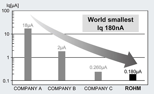 搭載了Nano Energy全新技術的產品之一就是「BD70522GUL」。該產品在支援以電池驅動的開關穩壓器中,實現了世界最低消耗電流180nA(圖2)。本文就針對「BD70522GUL」所搭載的Nano Energy技術做進一步介紹。