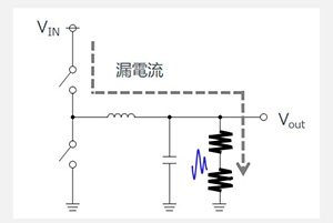「對元件漏電流的影響增加」是指組成電源IC的零件中MOSFET(Metal Oxide Semiconductor Field Effect Transistor)電晶體相關的問題。該電晶體即使在OFF狀態下也會流過一定的漏電流。該漏電流產生於內部電路或輸出段。例如,以流入回饋電阻的漏電流為例(圖4),如果是之前的電阻值,則相對於輸出電壓產生的穩態電流(=輸出電壓÷回饋電阻)漏電流十分小,因此可以忽略;但電阻增大後,穩態電流會變小,將無法再忽略漏電流的影響。