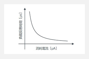 「類比電路的反應速度」是由諸多因素決定的,在此透過對電容的充電為例來考慮。充電到一定工作電壓的時間即反應速度,該反應速度與充電用的電流成正比,因此如果消耗電流減少,反應速度會變差(圖5)。