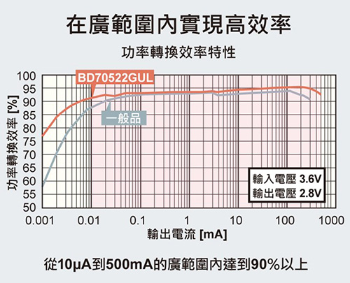 這個1μA的值就是電源IC工作時額定流過的平均消耗電流上限。也就是說,電源IC的消耗電流為nA級是必要條件。這樣就毋須增加電池的容量而是透過減少電源IC的消耗電流,來延長電子設備的連續運作時間。而「BD70522GUL」可將消耗電流降低到180nA,大幅延長了電池續航時間。