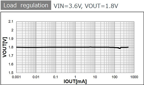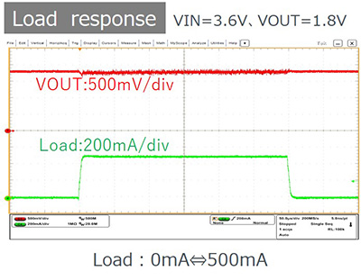以傳統的控制監測部的電路結構,通常並不可能同時改善低消耗電流、高速反應、高精度這三大特性。但是,若是利用BD70522GUL中搭載的Nano Energy技術,便能透過全面改善電路結構,進而成功地使傳統無法同時實現的三大特性得以同時改善。並且,也實現了更小的無負載時消耗電流、負載波動時的高速反應性(Load Response)以及整個負載範圍內穩定的輸出電壓(Load Regulation)(如圖8、9所示)。